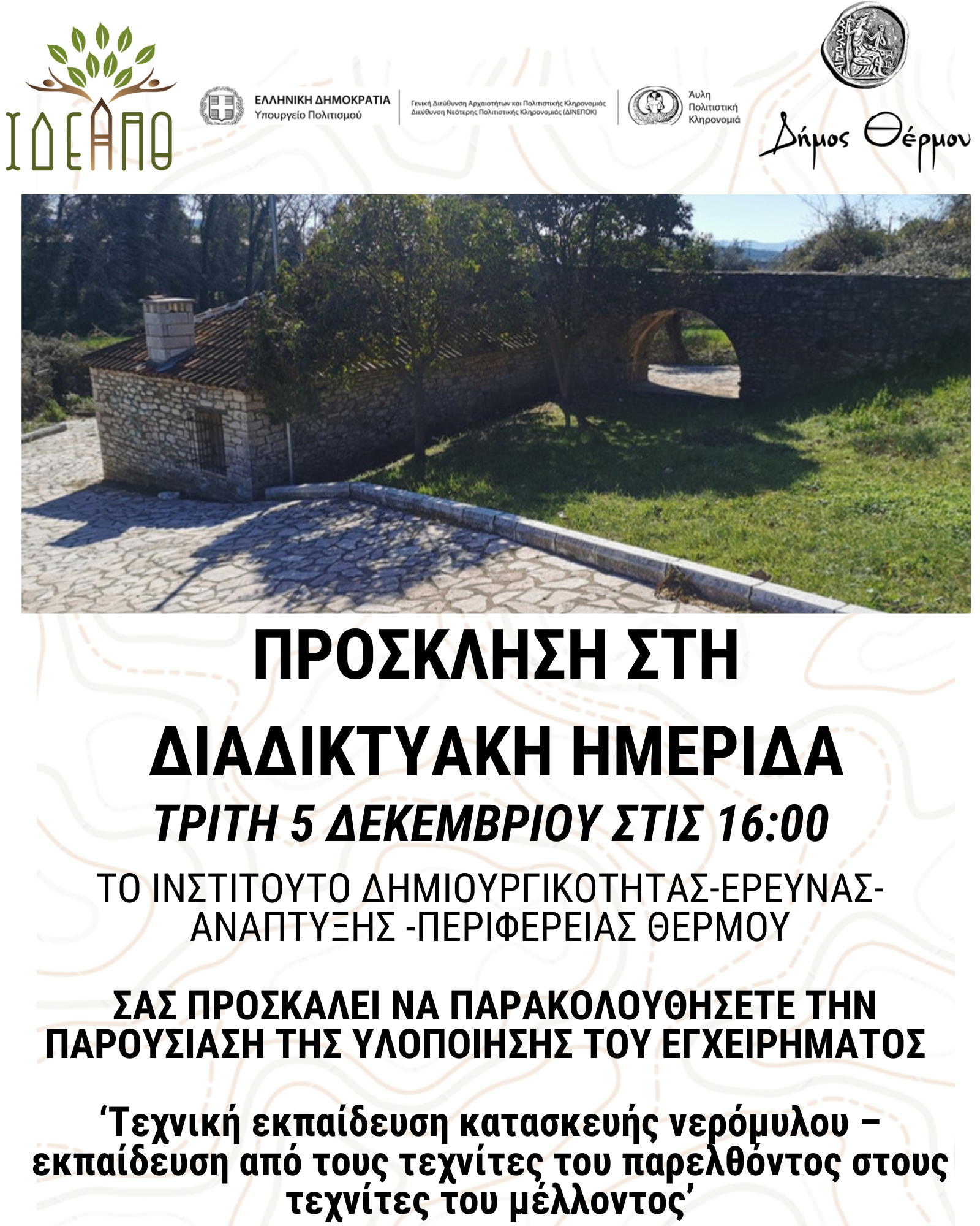Το Ινστιτούτο Δημιουργικότητας Έρευνας και Ανάπτυξης Περιφέρειας Θέρμου (Ι.Δ.Ε.Α.Π.Θ.) με αφορμή την υλοποίηση του προγράμματος για την διατήρηση της Άυλης Πολιτιστικής Κληρονομιάς ‘Τεχνική εκπαίδευση κατασκευής νερόμυλου – εκπαίδευση από τους τεχνίτες του παρελθόντος στους τεχνίτες του μέλλοντος’, που επιχορηγείται από το Υπουργείο Πολιτισμού, και σε συνεργασία με τον Δήμο Θέρμου, διοργανώνει την Τρίτη, 5 Δεκεμβρίου 2023, ώρα 16:00, Διαδικτυακή παρουσίαση – Ημερίδα, η οποία αποτελεί μια πρώτη παρουσίαση-αφήγηση του εγχειρήματος «Τεχνική Εκπαίδευση Κατασκευής Νερόμυλου». Ο δάσκαλος Βασίλης Χολέβας και έξι μαθητευόμενοι τεχνίτες κατασκευής νερόμυλου θα μοιραστούν μαζί μας την εμπειρία όλων των σταδίων κατασκευής νερόμυλου.